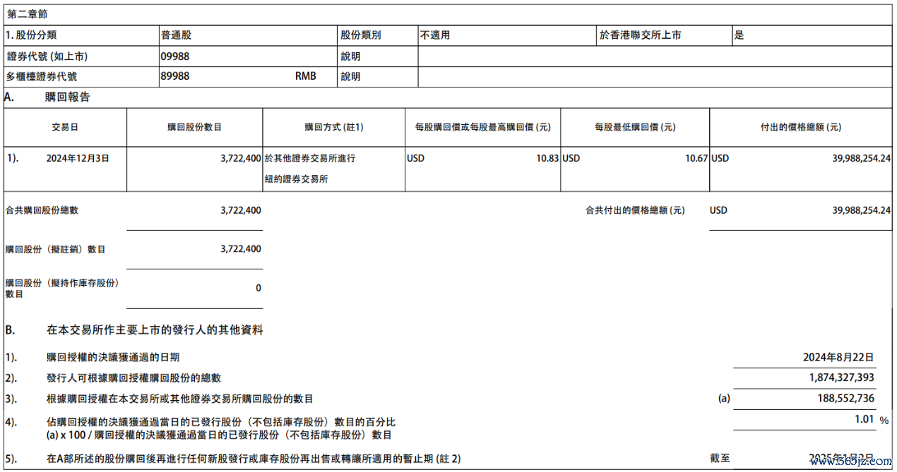 阿里巴巴:12月3日耗资约3998.83万美元回购372.24万股公司股份正规长沙配资平台阿里巴巴:12月3日耗资约3998.83万美元回购372.24万股公司股份