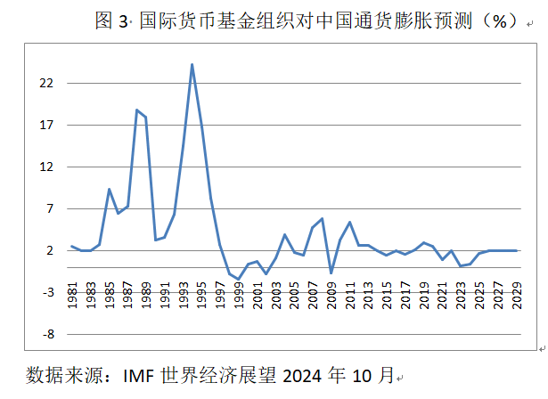 2024年一季度中国央行《货币政策执行报告》开始提出“把维护价格稳定、推动价格温和回升作为把握货币政策的重要考量,加强政策协调配合,保持物价在合理水平”,改变了过去央行认为“既无通胀也无通缩”的认识,说明央行对通缩担心升温。去年四季度《货币政策执行报告》“把促进物价合理回升作为把握货币政策的重要考量,推动物价保持在合理水平”。数据可见,新冠疫情之后的2023年和2024年中国通货膨胀只有0.2%,低于2022年2%的水平。
